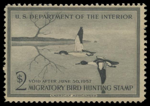 RW23 1956 Federal Duck Stamp. Unsigned, No Gum. Fine - Very Fine. Mergansers by Edward Bierly.