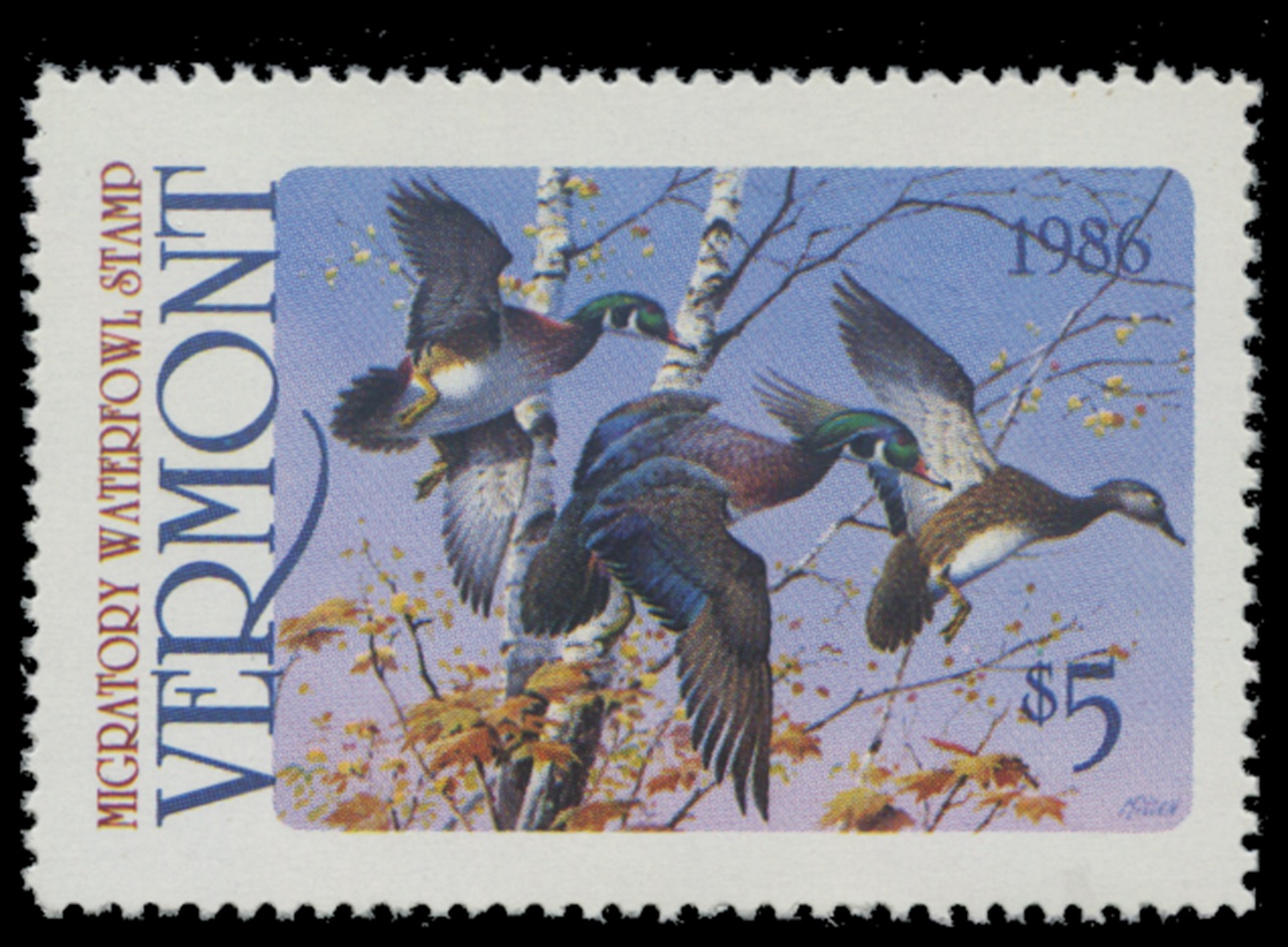 VT1 1986 State Duck Stamp. Mint Never Hinged. Very Fine. Wood Ducks by Jim Killen.