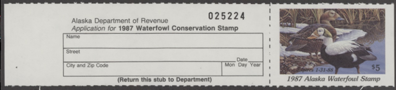 AK3A 1987 State Duck Stamp. Mint Never Hinged, First Hunter Type. Very Fine. Spectacled Eiders by Carl Branson.