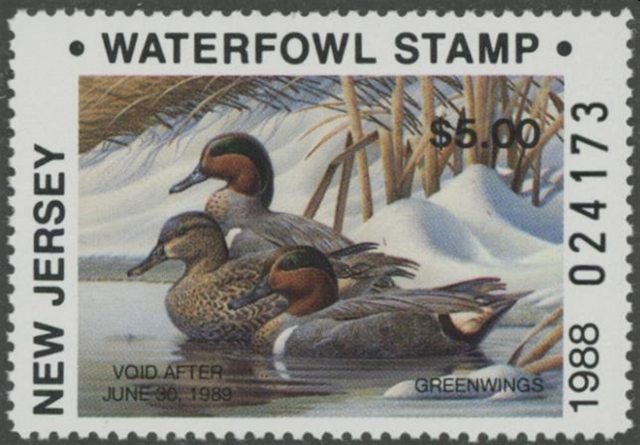 NJ10 1988 Non-Resident State Duck Stamp. Mint Never Hinged. Very Fine. Buffleheads by Bruce Miller.