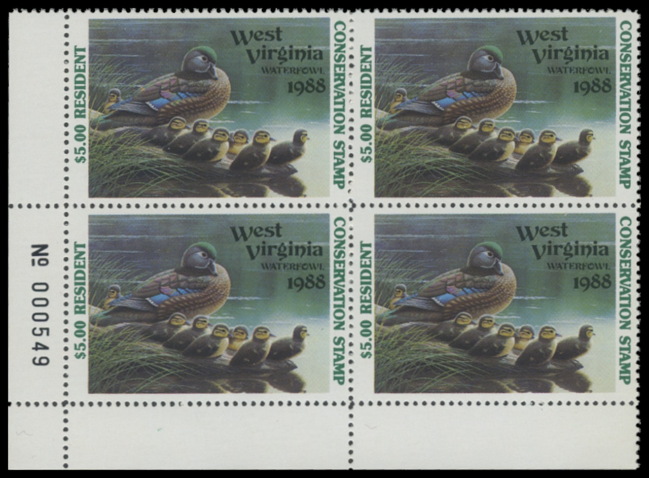 WV2 1988 State Duck Stamp. Mint Never Hinged. Very Fine. Wood Ducks by Steve Dillard.