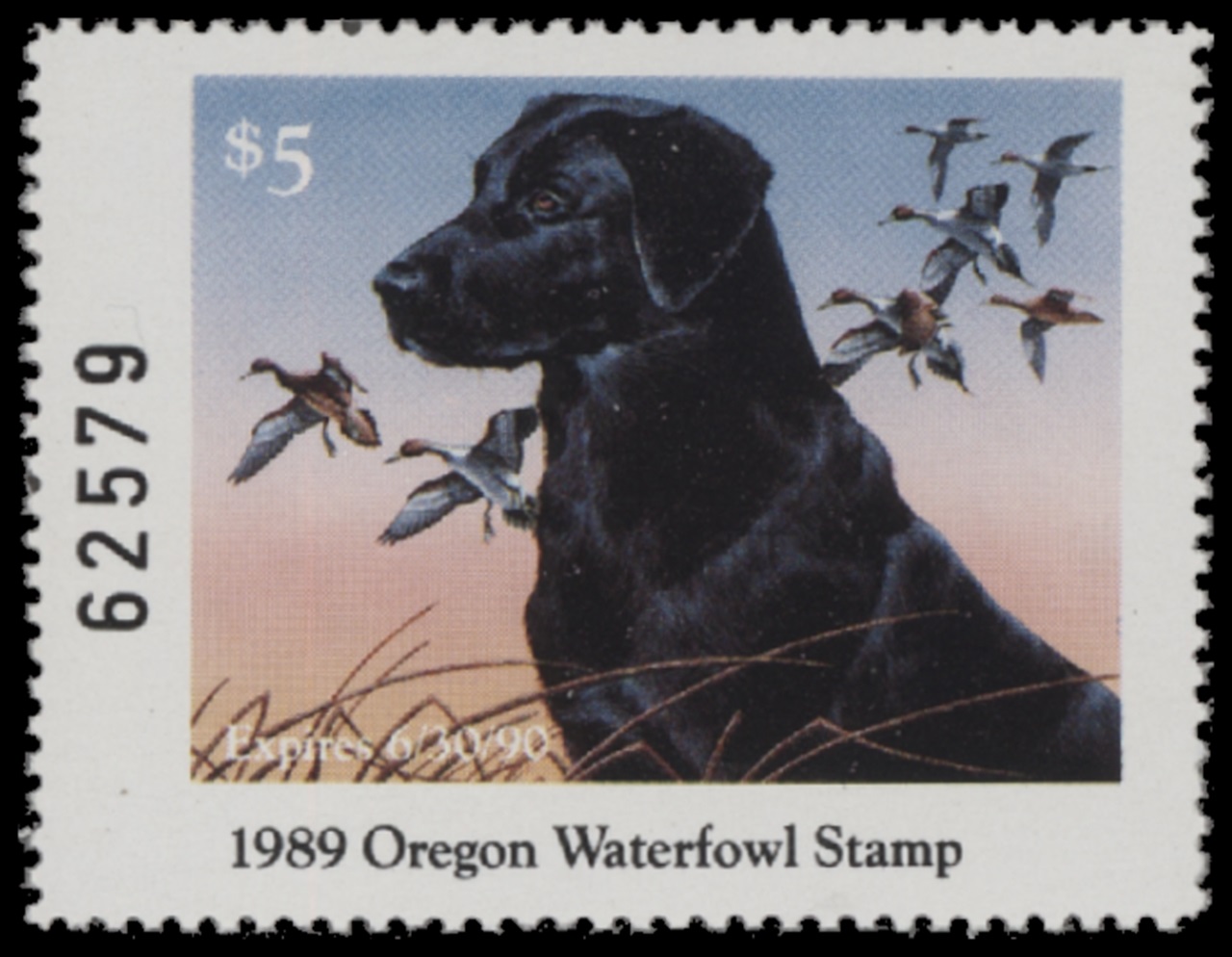 OR6 1989 State Duck Stamp. Mint Never Hinged. Very Fine. Black Labrador by Phillip Crowe.