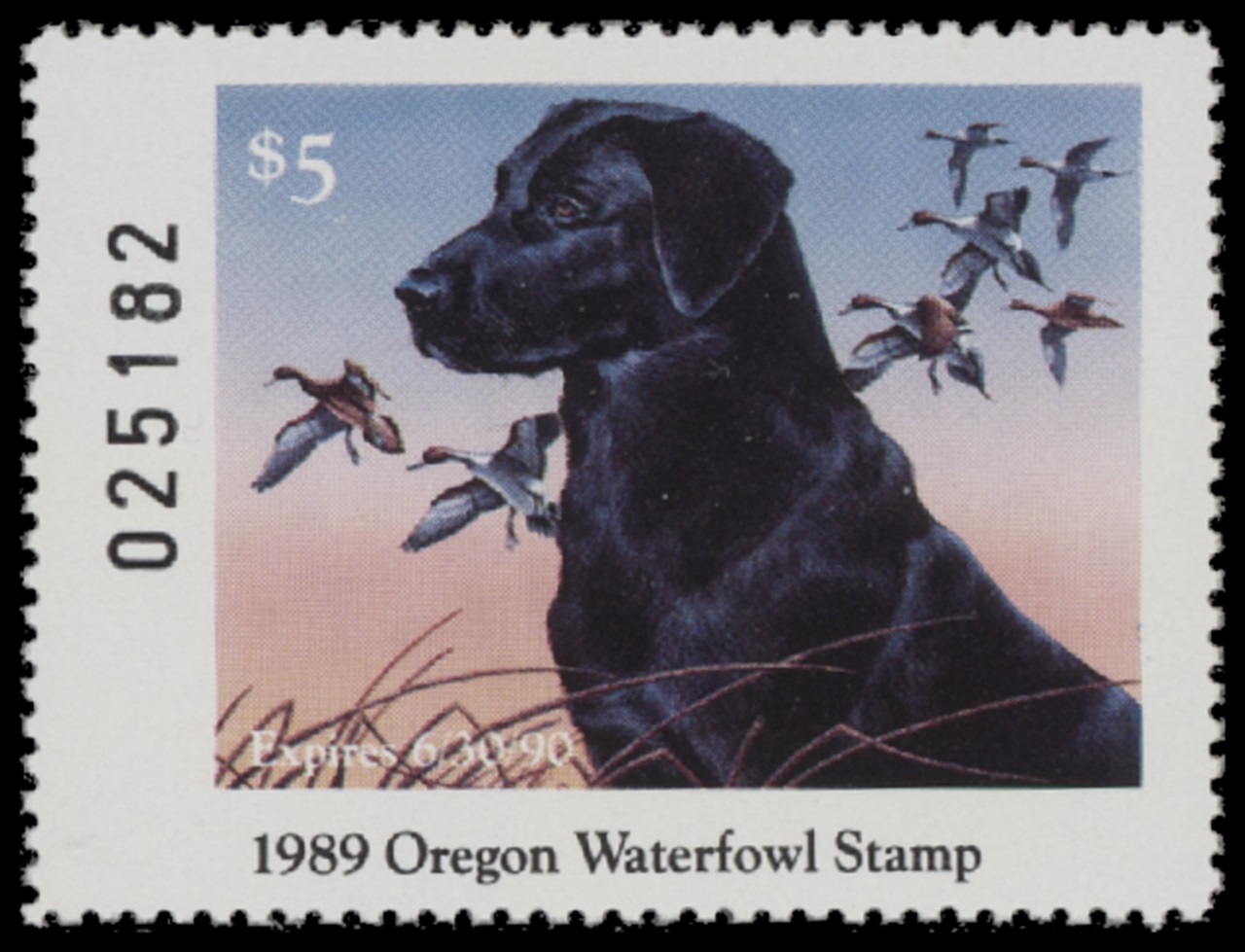 OR6 1989 State Duck Stamp. Mint Never Hinged. Very Fine. Black Labrador by Phillip Crowe.
