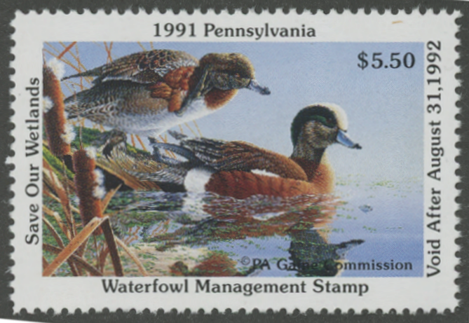 PA9 1991 State Duck Stamp. Mint Never Hinged. Very Fine. Pair of Widgeons by Gerald Putt.