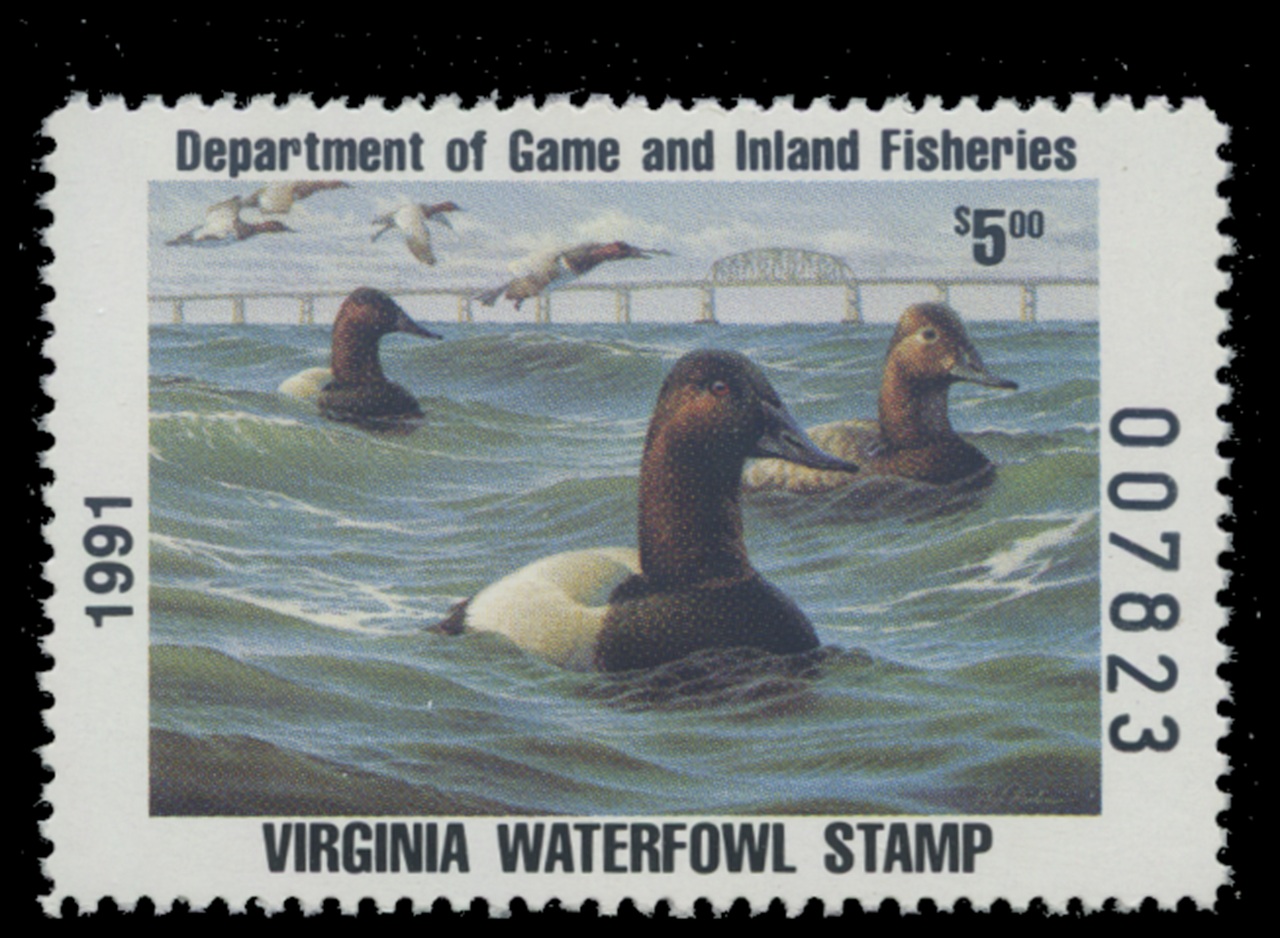 VA4 1991 State Duck Stamp. Mint Never Hinged. Very Fine. Canvasbacks by Rob Leslie.