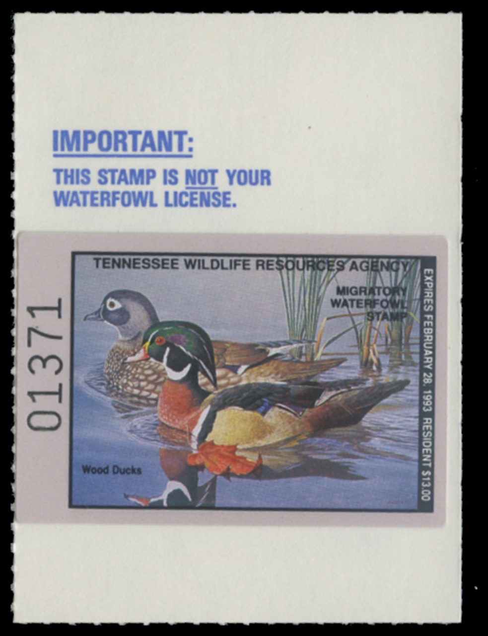 TN14 1992 State Duck Stamp. Mint Never Hinged. Very Fine. Wood Ducks by Thomas Hirata.
