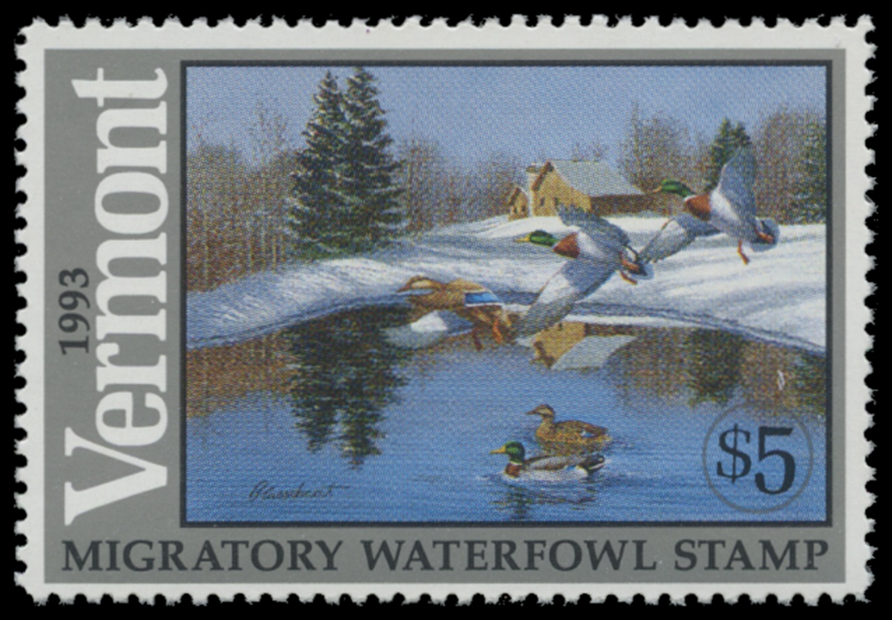 VT8 1993 State Duck Stamp. Mint Never Hinged. Very Fine. Mallards by Richard Plasschaert.