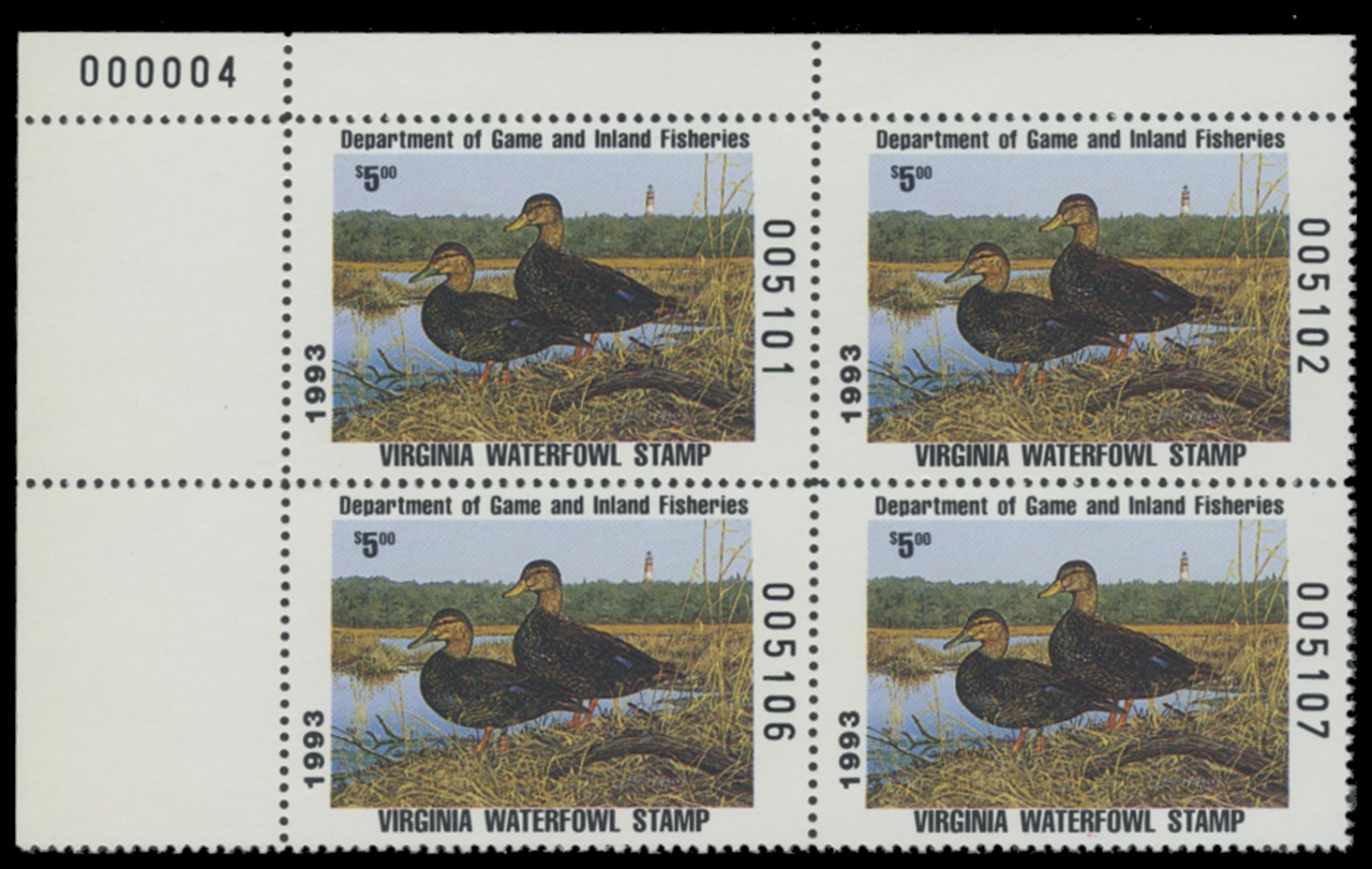 VA6 1993 State Duck Stamp. Mint Never Hinged. Very Fine. Black Ducks by Bruce Miller.