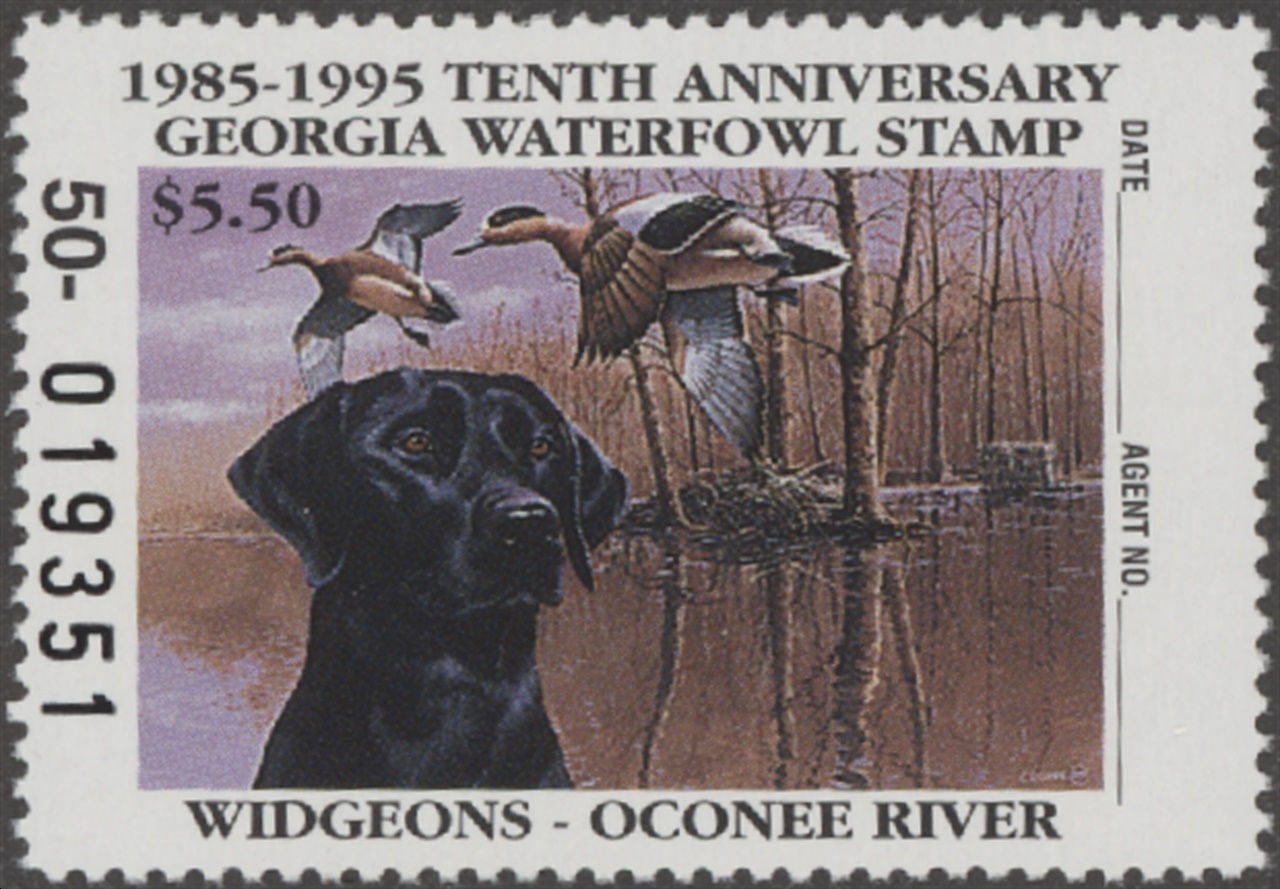 GA11 1995 State Duck Stamp. Mint Never Hinged. Very Fine. Widgeons and Black Lab by Phillip Crowe.