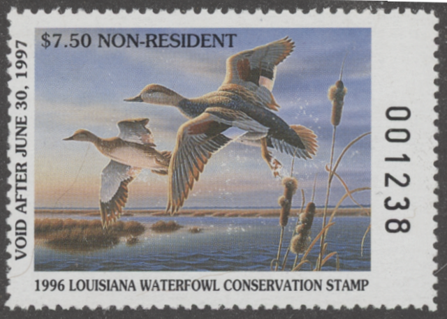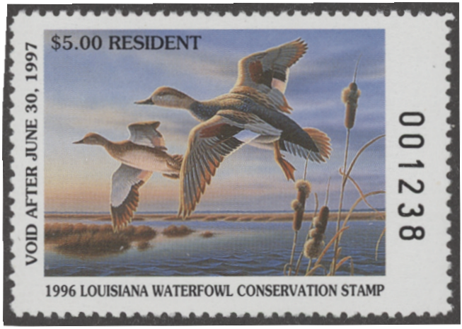 LA8 and LA8A 1996 State Duck Stamps Resident and Non Resident with Matching Serial Numbers. Mint Never Hinged. Very Fine. Gadwalls by Ronald J. Louque.