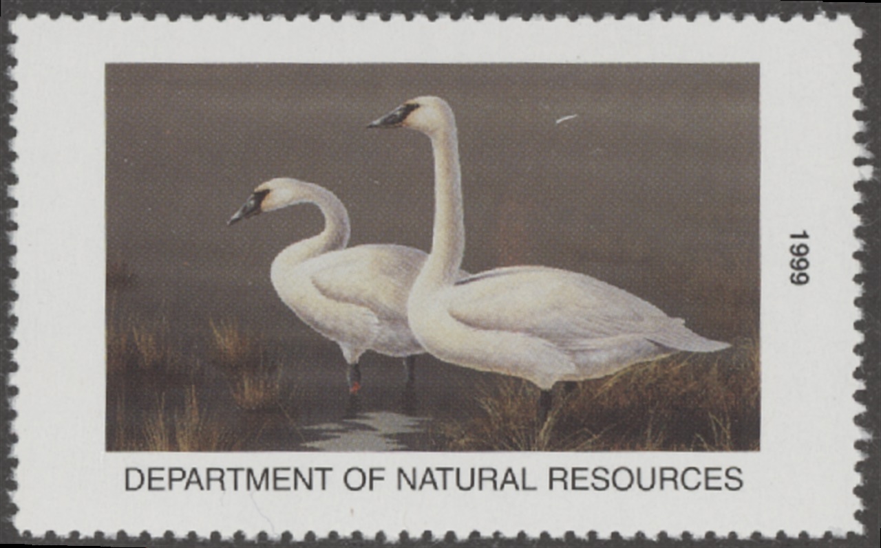IA28 1999 State Duck Stamp. Mint Never Hinged. Very Fine. Tiny White Mark on Face. Trumpeter Swan by Mark Anderson.