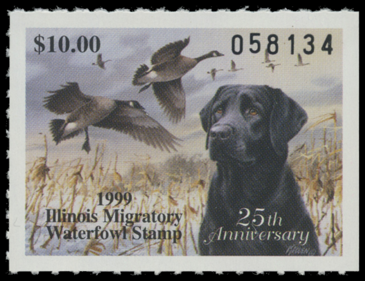 IL25 1999 State Duck Stamp. Mint Never Hinged. Very Fine. Black Lab & Canada Geese by Jim Killen.