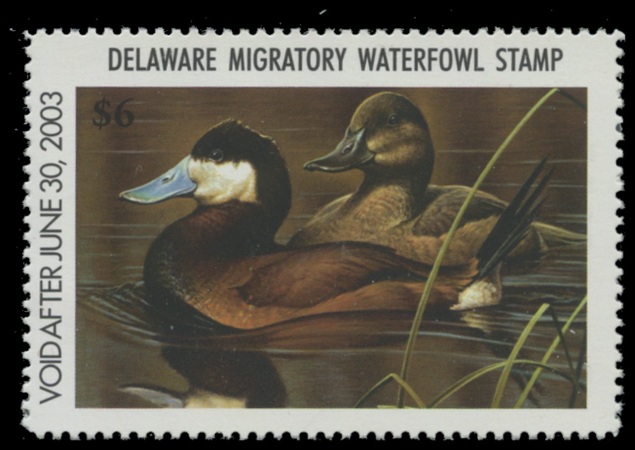DE23 2002 State Duck Stamp. Mint Never Hinged. Very Fine. Ruddy Ducks by George Lockwood.