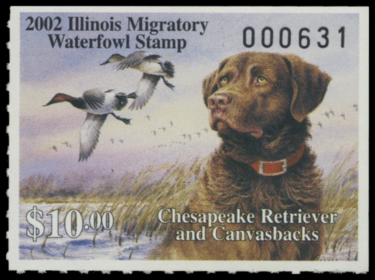 IL28 2002 State Duck Stamp. Mint Never Hinged. Very Fine. Chesapeake Retriever and Canvasbacks by Jim Killen.