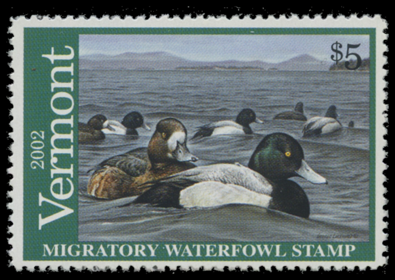 VT17 2002 State Duck Stamp. Mint Never Hinged. Very Fine. Greater Scaup by George Lockwood.