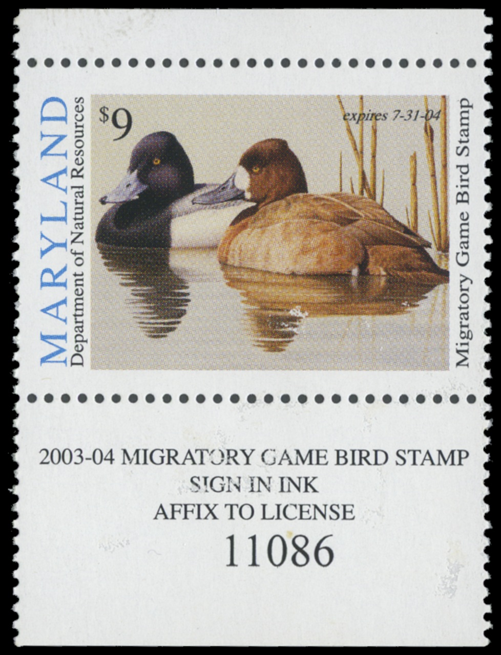 MD30 2003 State Duck Stamp. Mint Never Hinged. Very Fine. Lesser Scaup by Robert Bealle.