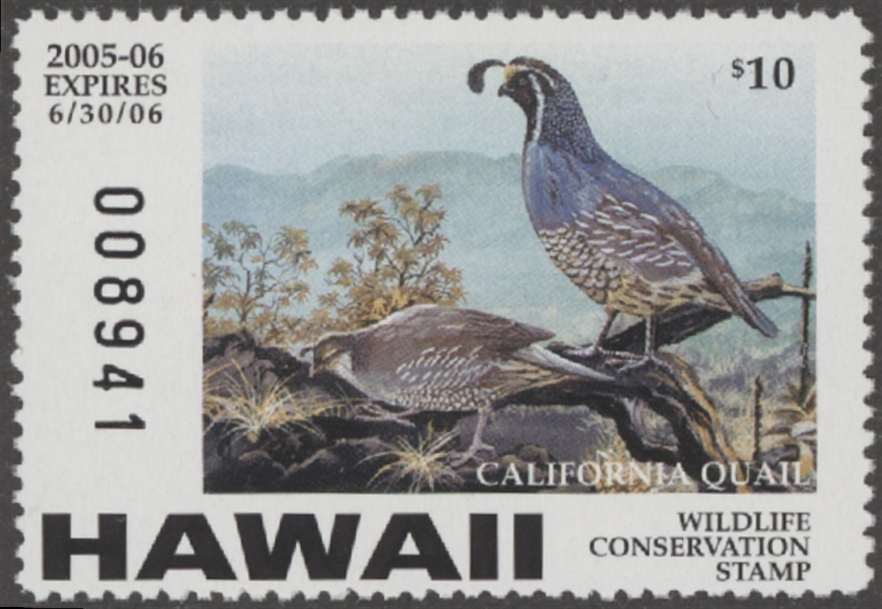 HI10 2005 State Duck Stamp. Mint Never Hinged. Very Fine. California Quail by Norman Nagai.
