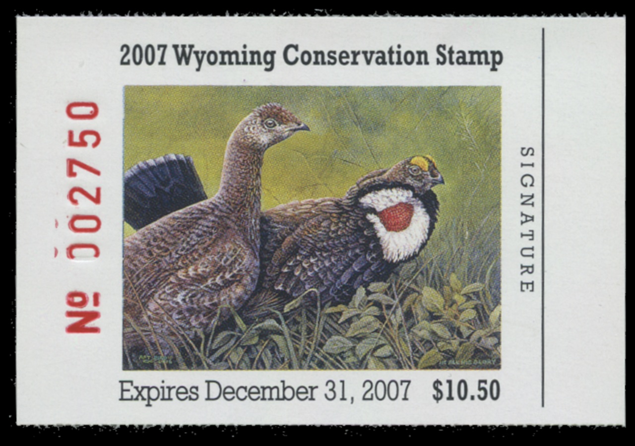 WY24 2007 State Duck Stamp. Mint Never Hinged. Very Fine. Prairie Chicken by Art Biro.
