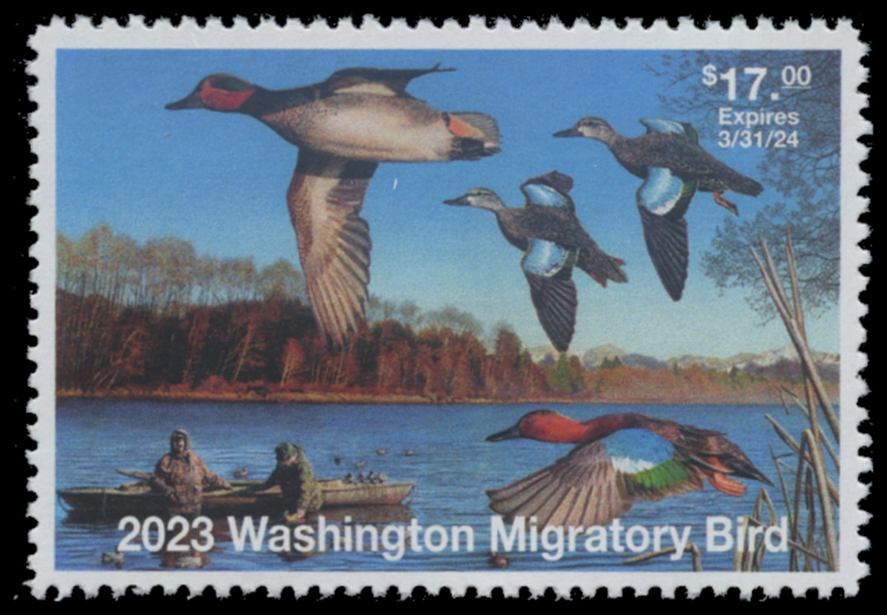 WA38 2023 State Duck Stamp. Mint Never Hinged. Very Fine. Hunter with Teal by John N. Harris.