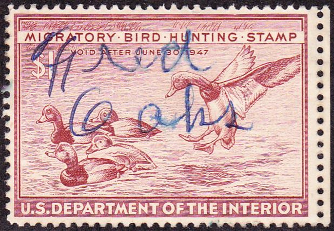RW13 1946 Federal Duck Stamp. Used with Most Original Gum. Fine - Very Fine Centering. Redhead Ducks by Robert W. Hines.