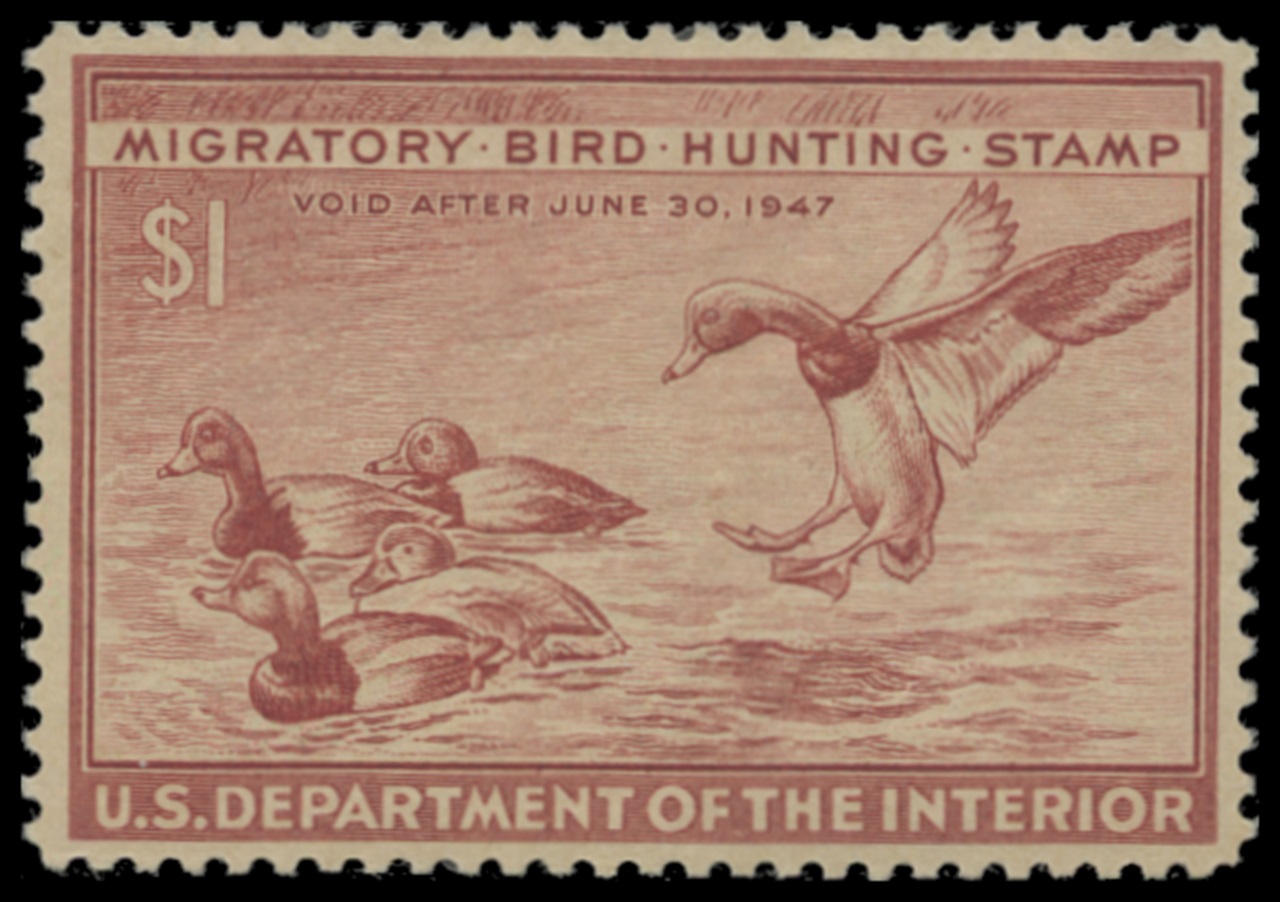 RW13 1946 Federal Duck Stamp. Mint Lightly Hinged. Fine - Very Fine. Redhead Ducks by Robert W. Hines.