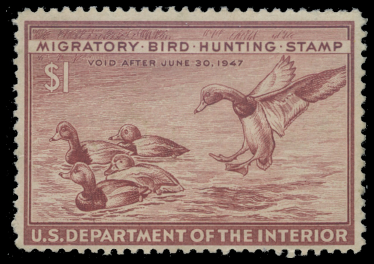 RW13 1946 Federal Duck Stamp. Mint Lightly Hinged. Fine - Very Fine. Redhead Ducks by Robert W. Hines.