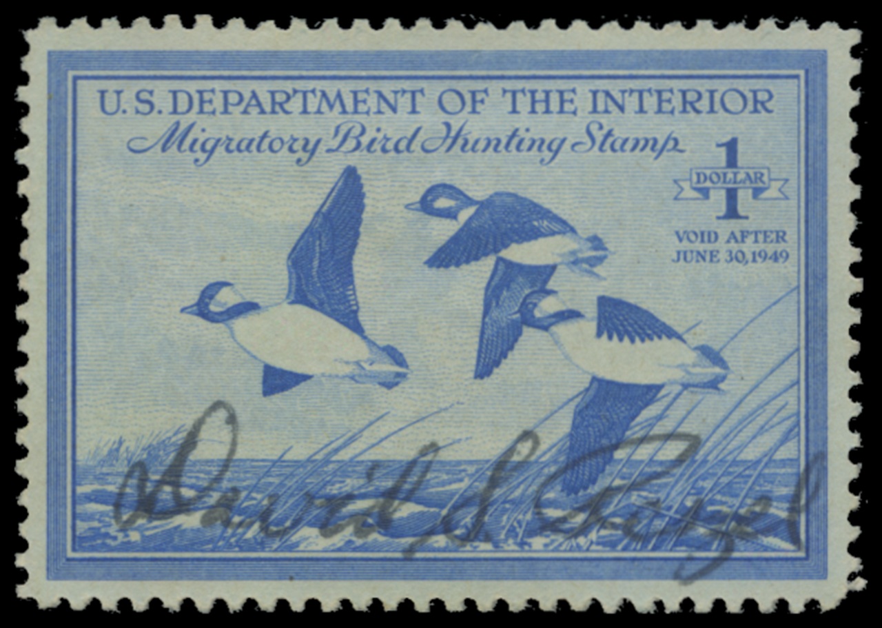 RW15 1948 Federal Duck Stamp. Used. Fine - Very Fine. Buffleheads by Maynard Reece.