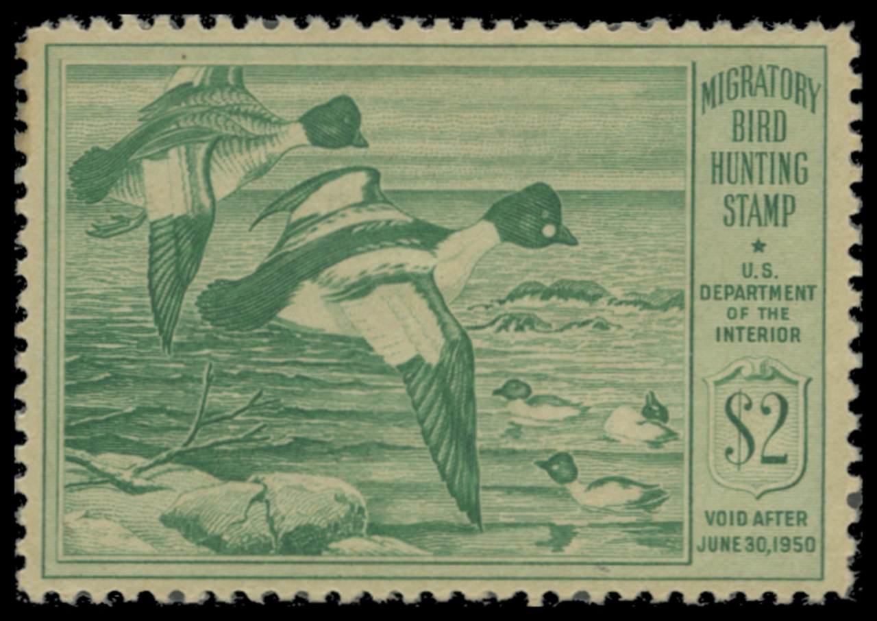 RW16 1949 Federal Duck Stamp. Mint Lightly Hinged. Fine - Very Fine. Goldeneyes by Roger E. Preuss.