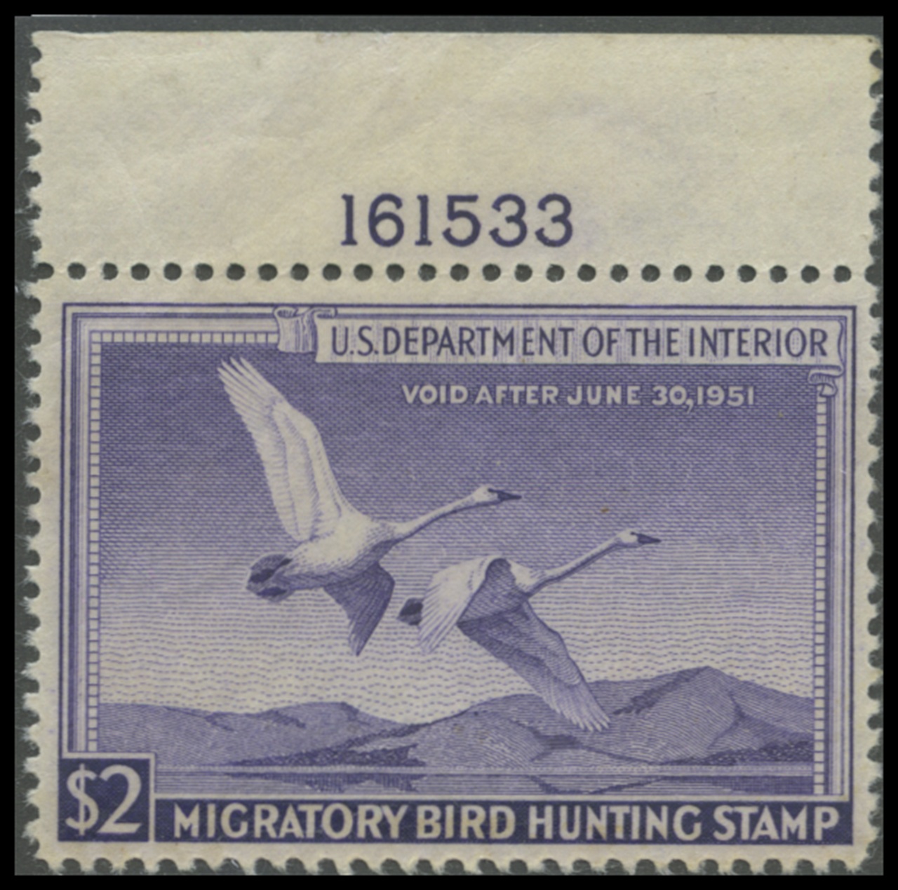 RW17 1950 Federal Duck Stamp. Mint Never Hinged. Fine - Very Fine. Trumpeter Swans in Flight by Walter Weber.