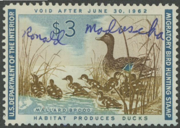 RW28 1961 Federal Duck Stamp. Used. Very Fine - Extra Fine Centering. Mallard Brood by Edward Morris.