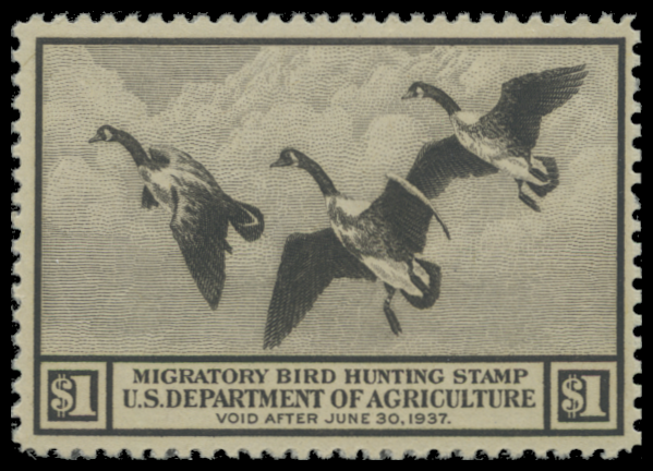 RW3 1936 Federal Duck Stamp. Mint Never Hinged. Fine - Very Fine. Canada Geese in Flight by Richard Bishop.