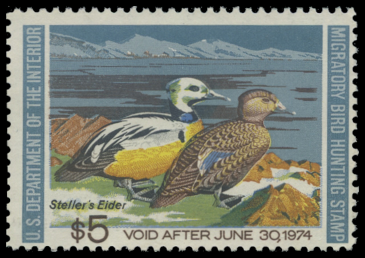 RW40 1973 Federal Duck Stamp. Unsigned, No Gum. Fine - Very Fine. Steller's Eiders by Lee LeBlanc.