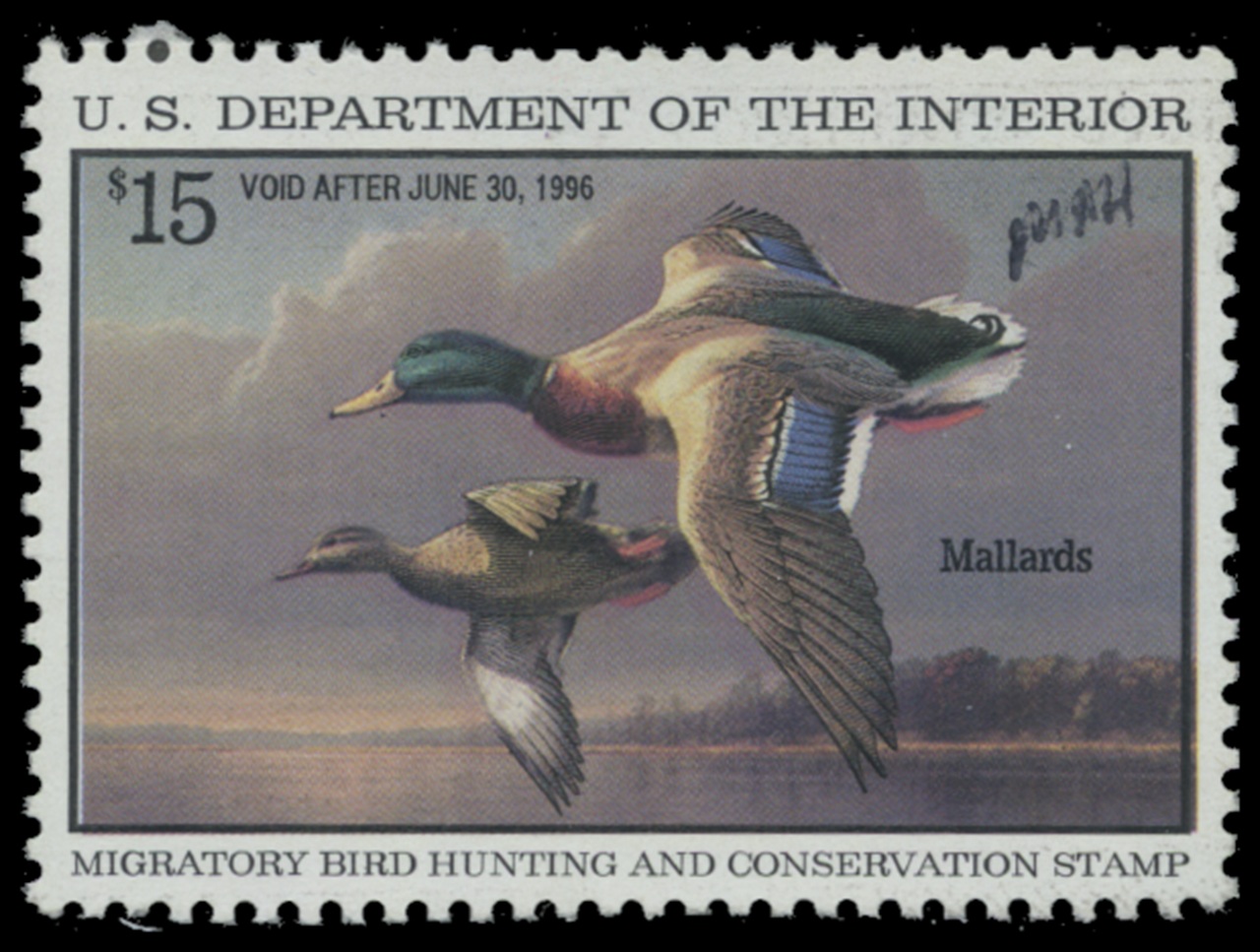 RW62 1995 Federal Duck Stamp. Used. Fine - Very Fine. Mallards by Jim Hautman.