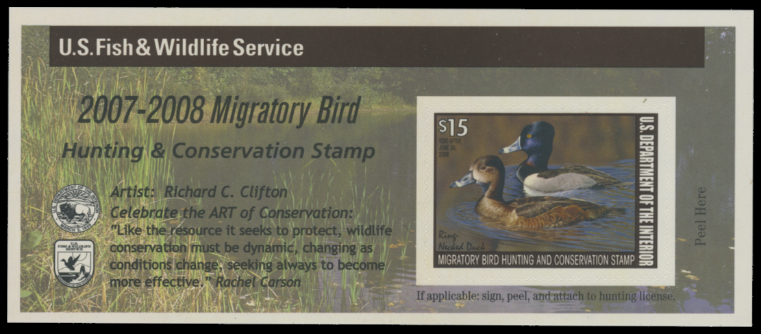 RW74A 2007 Federal Duck Stamp. Mint Never Hinged. Fine - Very Fine. Ring-necked Duck by Richard Clifton.