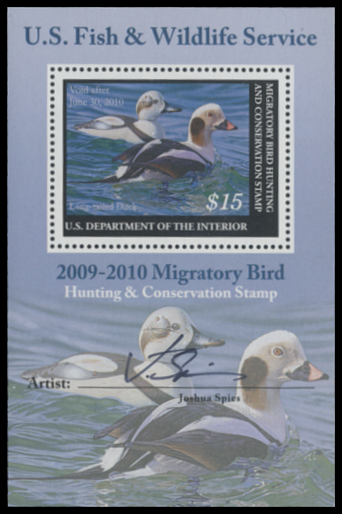 RW76B 2009 Federal Duck Stamp. Mint Never Hinged. Fine - Very Fine. Long-tailed Ducks by Joshua Spies.