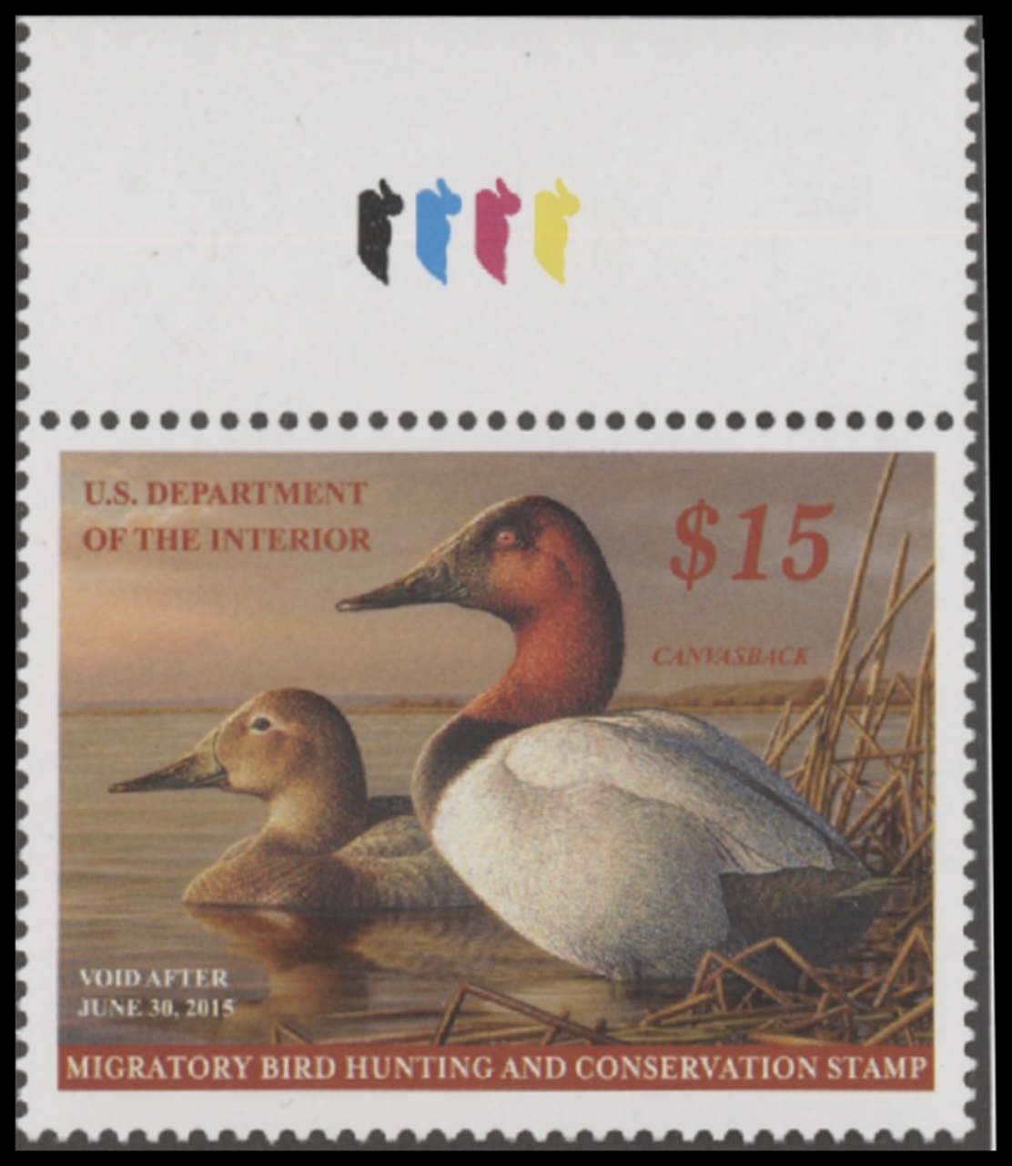 RW81 2014 Federal Duck Stamp. Mint Never Hinged. Fine - Very Fine. Canvasbacks by Adam Grimm.
