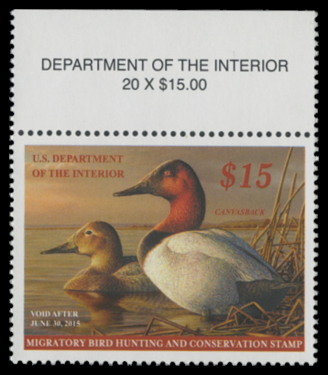 RW81 2014 Federal Duck Stamp. Mint Never Hinged. Fine - Very Fine. Canvasbacks by Adam Grimm.